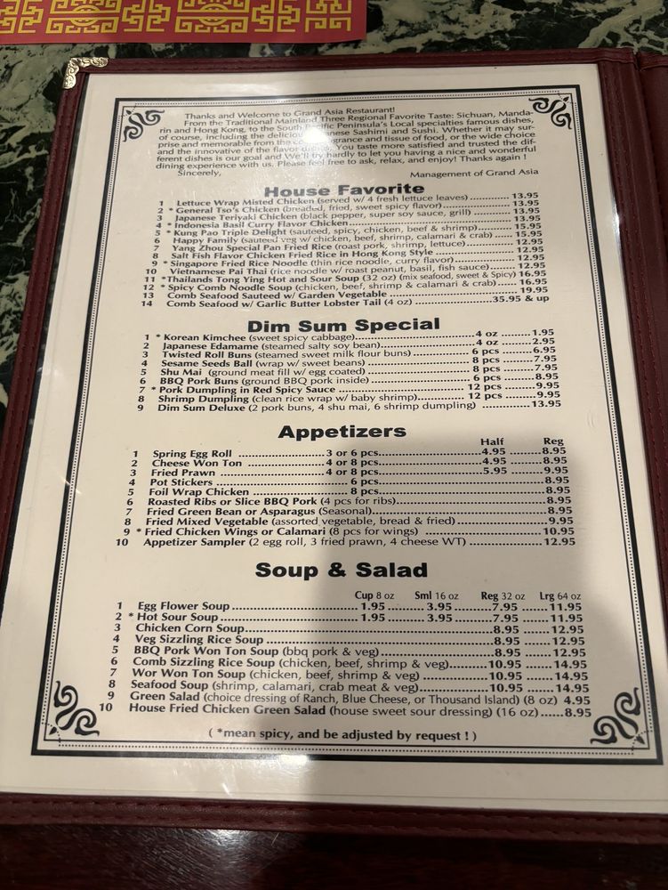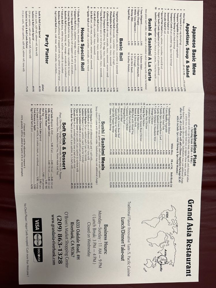 Grand Asia is a casual dining spot in Riverbank, CA offering a diverse menu with many vegetarian options. With a variety of appetizers like Roast BBQ Ribs, Cream Cheese Won Ton, and Dim Sum Deluxe, there's something for everyone. The Dim Sum Specials section features unique dishes like BBQ Pork Buns and Mr and Mrs Smith, showcasing bold flavors and spices. House favorites like Comb Seafood and General Tso's Chicken are sure to satisfy any craving. The restaurant also caters to various dietary preferences and offers delivery, takeout, and catering services. With a welcoming atmosphere and attentive waiter service, Grand Asia is a great choice for a delicious and memorable dining experience.